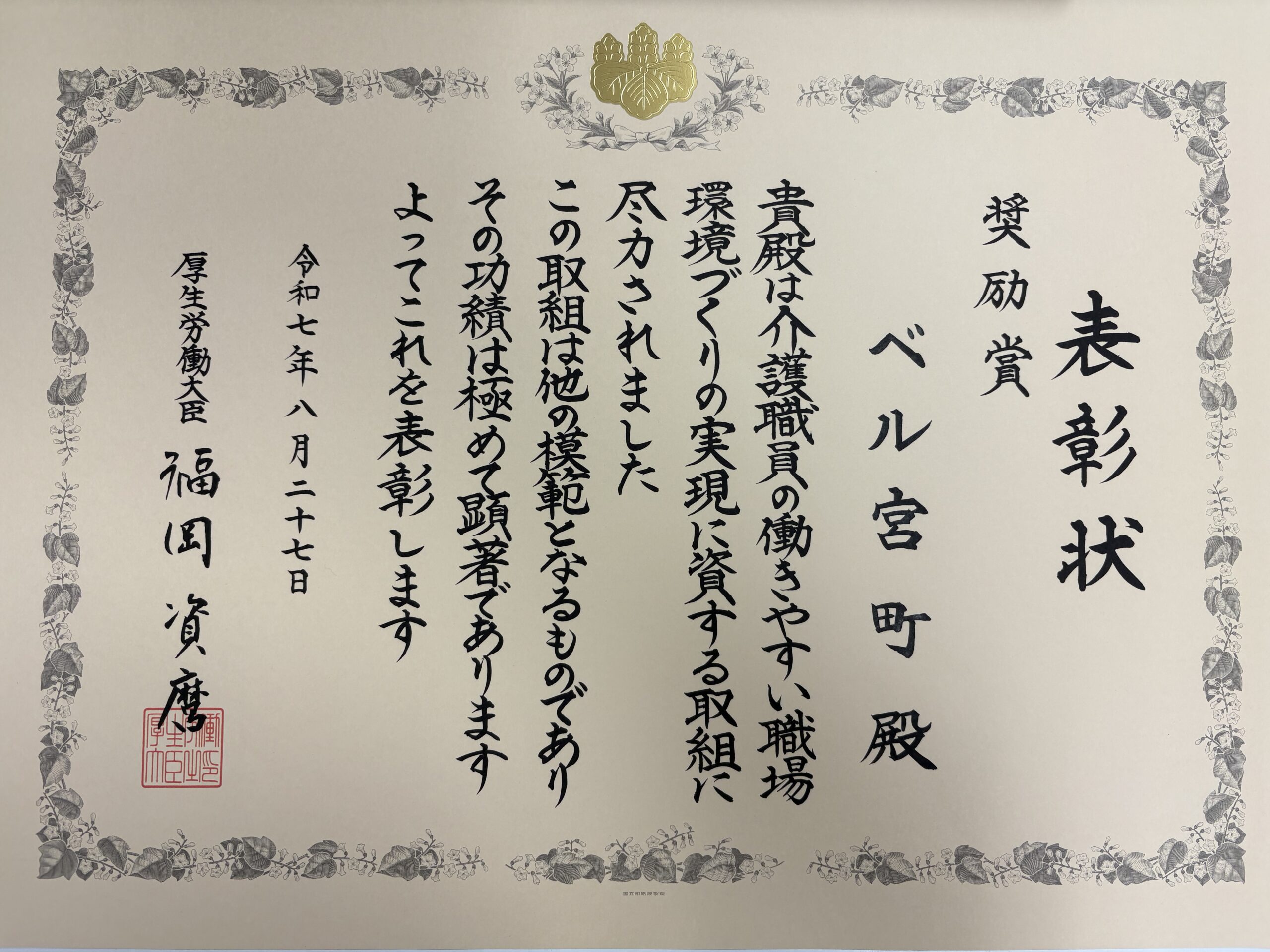 この度、令和7年度介護職員の働きやすい職場環境づくり内閣総理大臣および厚生労働大臣表彰として、