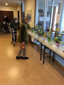 利用者様のフラワーアレンジメントの作品は、寒河江の花泉様より様々なお花をご準備いただき、素敵な作品となりました。