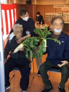 施設内の畑「ベルファーム」で育てた大根で田楽を作り、利用者様全員で食べ、楽しみました。