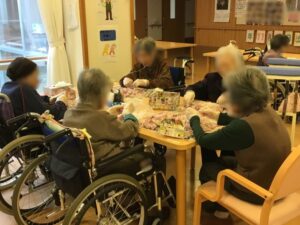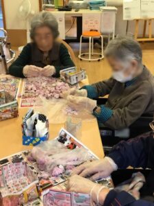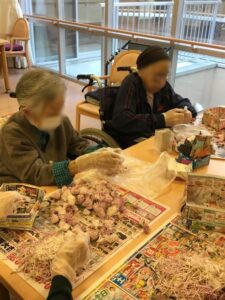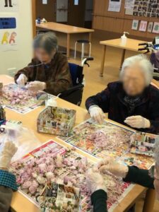 「もって菊」の花びらとりを利用者様からお手伝いしてもらいました。