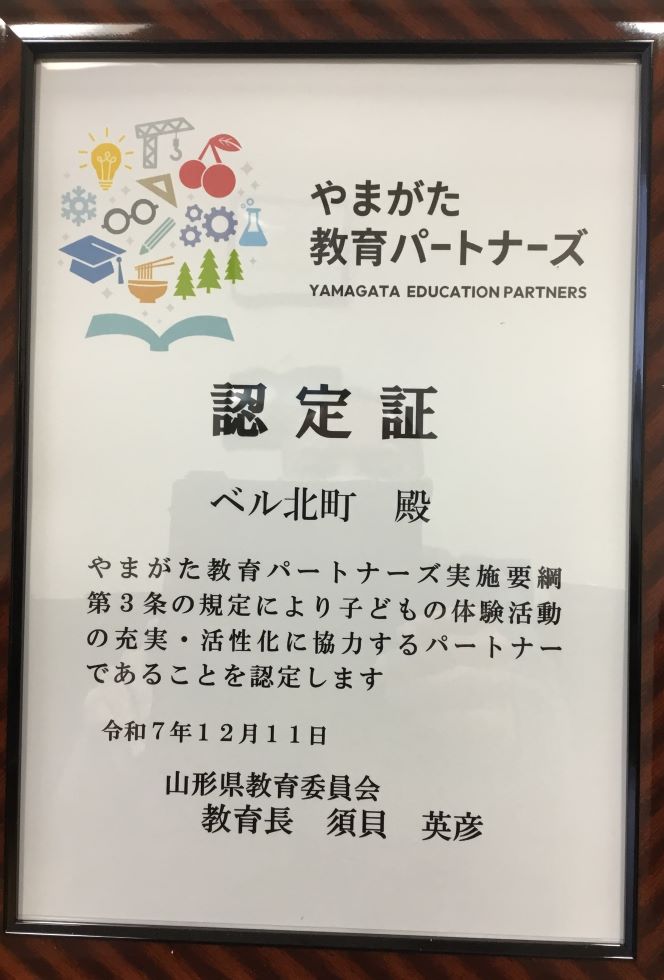 このたび、山形県が実施している「やまがた教育パートナーズ」にベル宮町・ベル北町・ベルライフ宮町が認定されました。この活動は、「企業・団体等の得意分野を生かして、子供たちの体験活動や学びを充実させるための事業」へ企業として協力する活動です。当法人ではこれまでも独自の活動として、近隣の学校との交流会や総合学習の受け入れを実施していましたが、今回の認定を受けて、より子ども達の教育や成長に繋がるように協力していければと思います。