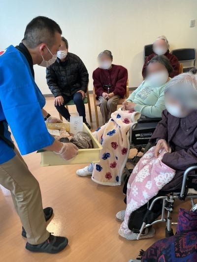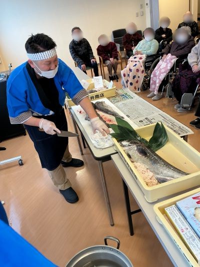 利用者の皆様の前で捌き、昼食にて寒鱈汁として提供しました。皆様「身がしっかりして美味しいね」
