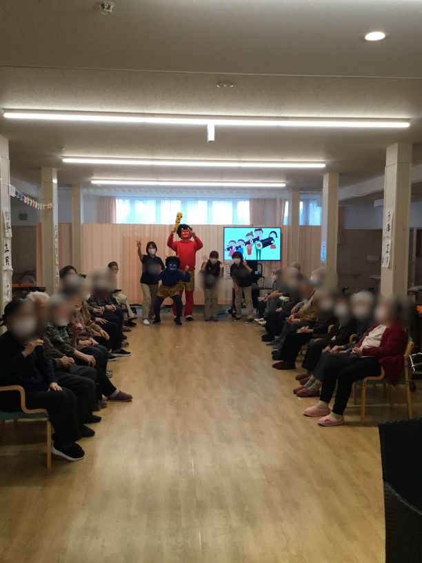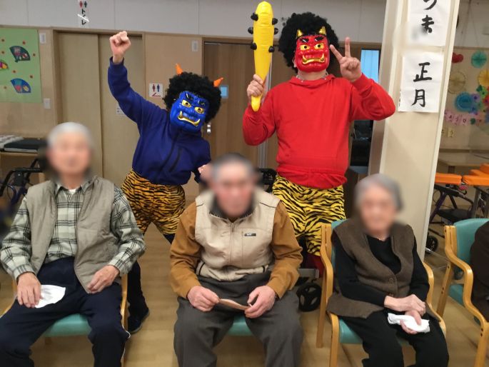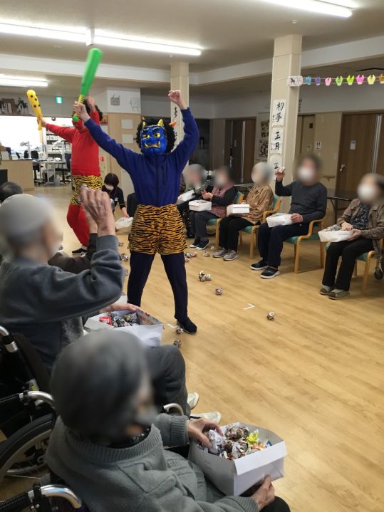 2/3にベルライフ宮町にも鬼がやってきました。利用者の皆様一丸となって「鬼は外福は内」の掛け声に合わせ鬼めがけ紙玉を投げると、「まいりました~」と鬼を追い払うことに成功。